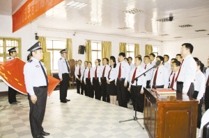 5月19日上午,扶沟县人民法院在大法庭隆重举行员额法官宪法宣誓仪式。现场庄严肃穆,高悬的国徽熠熠生辉。司法警察高举五星红旗,迈着整齐的步伐步入会场。全体员额法官身着制服,齐唱中华人民共和国国歌。随后,员额法官在党组书记、代院长徐林的带领下,34名首批员额法官面向国旗,举起右拳,发出铿锵有力的誓言:“忠于中华人民共和国宪法,维护宪法权威,履行法定职责,忠于祖国,忠于人民,恪尽职守,廉洁奉公,接受人民监督,为建设富强、民主、文明、和谐的社会主义国家努力奋斗!” 通讯员 樊帅 摄