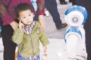 5月26日,一名小朋友在2017中国国际大数据产业博览会上参观机器人。