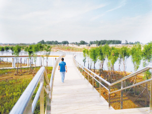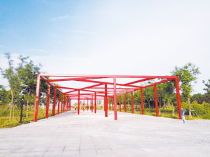 在项目郑洼村段,光影长廊和空中走廊吸引了周口晚报记者的目光。光影长廊高约6米,红色钢结构廊架,尤为引人注目。450米长的空中走廊横跨彩色堤顶路,连接堤外广场和堤内景观带,走在上面,廊下景物一览无余。
