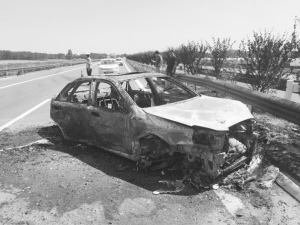 5月27日13时15分许,在新周高速103公里处东半幅,司机因疲劳驾驶,造成车辆驶离车道撞上护栏,导致车辆自燃。接到报警后,我市高速交警和消防官兵立即前往现场处理。到达现场后,消防官兵对自燃车辆的残壳进行冷处理后,用拖车将其拖走。据了解,事故未造成人员伤亡。图为轿车被烧成空壳。晚报记者 朱东一 摄