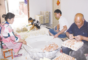 苑庆丰如今也发了家,他的儿子都在做变蛋生意,产品大都销往周口市区各个超市。“每天过手一万多个鸡蛋,每个鸡蛋都要放到灰锅里沾灰,再滚锯末,然后储存,有一点点裂痕的鸡蛋都不能用。”苑庆丰说,“一季儿下来能挣个三四万块钱。现在不需要外出卖变蛋了,一家人守在一起干点儿副业,挣点儿辛苦钱。”