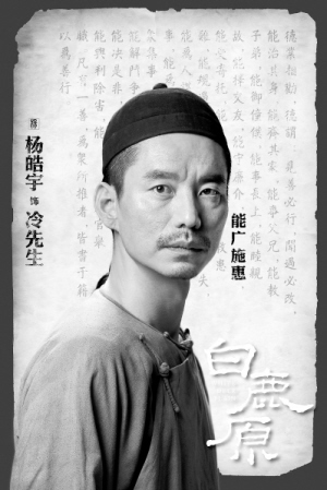 《白鹿原》小说对冷先生的描述是人如其姓,面冷心冷,不急不躁,看死人看活人是一副面孔。他和白鹿两家结了亲家,对自己的女儿见死不救,也当真够冷,但对导致自己女儿守活寡抑郁成疾的女婿鹿兆鹏,却掏出全部家底8麻袋银元舍命相救。这样一个表情不多,性情冷怪的角色,可供演员表现的空间不大。杨皓宇的办法是,先理解再融入,让自己像冷先生那样活一回。他说:“我通过一次一次的调整和碰撞,觉得他是一个活生生的人物,之前我想的都是怎么去演一个人物,现在更多的是叫这个人物去生活。这种表演观给我了一种新的东西。有时候一个眼神就够了,不用太多的台词。”把自己“活”成冷先生后,杨皓宇感觉冷先生并不冷,女儿去世的两场戏,他反复琢磨怎么演,“虽然女儿嫁出去就是泼出去的水,但是感情还是在那里,他知道女儿过得并不幸福而且上吊了。还有下葬回来之后,拍的那四五条,我把很多没有机会展现的情感都展现出来了,不想让观众觉得他是真正的冷酷无情,他是有感情在的。我做功课的时候知道,这两个女儿是由他一个人抚养长大,直到把她们嫁出去,这就是冷先生的全部。”