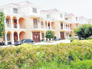 周口晚报记者在通往社区服务中心的道路两侧看到,整齐划一的3层别墅,配以粉红色外墙、华丽的白色立柱、拱形的房檐和回廊,再加上高大的门和气派的装饰,显得清新而不落俗套。