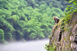 6月3日,一只猕猴蹲在温塘河岸边。位于重庆渝北区的统景“小三峡”是猕猴栖息地,生活在温塘河两岸的猴群上山觅食、下河游泳,野趣十足,吸引众多游客前来观赏。