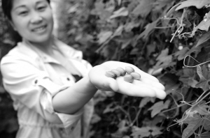 6月6日,江苏省镇江市蔬菜研究所工作人员展示成熟的“拇指西瓜”。