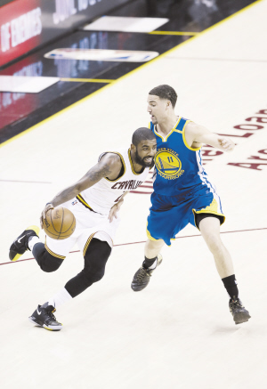 当日,勇士队球员汤普森(右)在比赛中防守骑士队球员欧文。