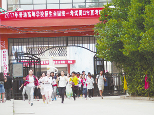 昨日下午,随着铃声准时敲响,2017年高考宣告结束。几名率先从周口二高考点跑出来的考生,看起来心情不错。晚报记者 宋风 摄