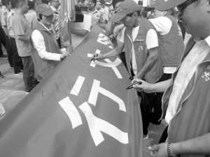 6月13日上午,周口市文明交通助力城市治理行动在五一文化广场启动。图为市民在“自觉践行文明交通 共同助力城市治理”条幅上签名,承诺将从自己做起,安全文明出行,积极参与文明交通助力城市治理行动。晚报记者 朱东一 摄