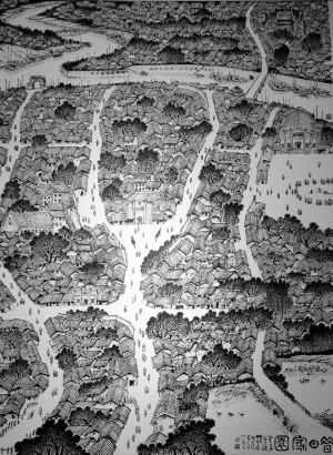 仔细观察,您会发现那时的关帝庙、二板桥、磨盘山、铁水牛、剧场、电影院、文化馆、广播站、五间楼、牲口市、三连坑均在此作品中,再细看书店、银行、邮电局及各类店铺也都有显现。