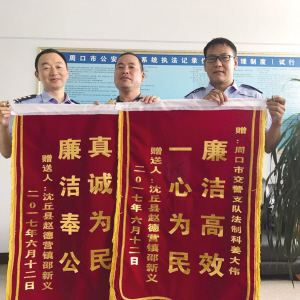 本报讯 有时候,一张普通的驾驶证就是一张“工作证”,是养家糊口的重要证件。沈丘县人邵师傅A2驾驶证被人套用后,在全国各地违法近百起,扣分高达300多分,驾驶证处于“停止使用”状态,因此自己丢了驾驶员工作。我市交警支队法制科民警收到邵师傅反映后,积极帮他协调处理,目前驾驶证已恢复正常使用,他于6月14日将两面写有“廉洁高效 一心为民”的锦旗送到民警手中。