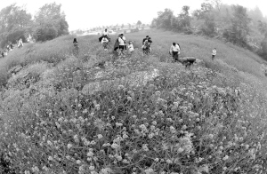 6月17日,人们在湖北省宣恩县锣圈岩景区马鞭草花丛中游玩。