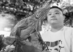 6月20日,观众在黑龙江省博物馆观察红鬣蜥。