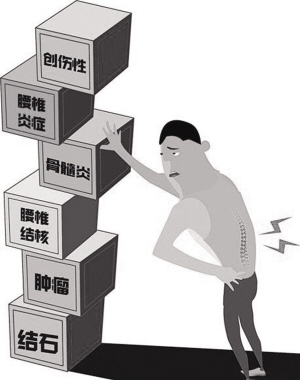 常见的腰痛是由腰椎的退行性变、慢性损伤等引起的,包括我们常听说的腰椎间盘突出,但腰痛不一定就是腰椎间盘突出。“临床上引起下腰痛的疾病相当复杂,一般将其病因分成五大类,数百种疾病均可引起腰痛。”专家对记者表示,腰痛最常见的原因是腰椎间盘突出。此外,有的腰痛是创伤性的,有的则因腰椎炎症、骨髓炎、腰椎结核等原因;也有的是腰椎肿瘤、腰椎周围组织肿瘤导致的;结石等也会引发剧烈腰痛。