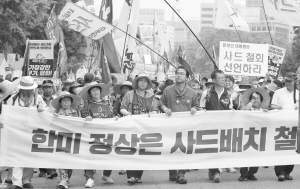 6月24日,在韩国首尔市中心,韩国民众手举要求“韩美首脑撤回部署萨德”的标语参加游行。