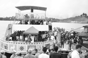 6月25日,在哥伦比亚西北部安蒂奥基亚省瓜塔佩市,救援人员和警察乘船前往沉船地点进行搜救。
