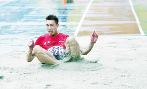 6月26日,辽宁队选手朱亚明在男子三级跳远决赛中。