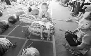 6月27日,一名小朋友在“斗瓜”大赛比赛现场品尝西瓜。