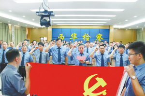 6月27日10时,在西华县检察院党组书记、检察长郑清朝的带领下,全院党员干警身着蓝色制服,面向党旗,重温入党誓词,以特殊方式纪念党的生日。通讯员 杨梓芸 摄