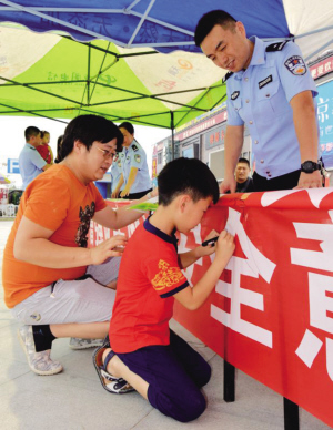 6月28日,商水县公安局组织民警走上街头、社区、商场等开展《网络安全法》的宣传活动,进一步增强市民的网络安全意识,营造出人人关注网络安全、依法维护自身权益的良好氛围。图为市民支先生与儿子在维护网络安全条幅上签名。