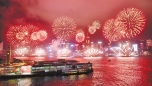 在观众的尖叫与欢呼声中,香港特别行政区成立20周年主题曲《香港·我家》的动人音乐响起,维港上空瞬间绽放出红色、黄色与绿色的巨型烟花。紧接着,红色的“中国HK”“20”和紫荆花图案相继将夜空点亮,这些都是特意为庆祝香港回归20周年所设计的图案。