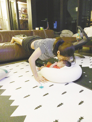 本报综合消息 7月1日,辣妈Ella晒出在家带儿子的照片(右图)。她脚放在沙发上做俯卧撑,亲吻着躺在身下的儿子,笑称儿子是“健身教练”。