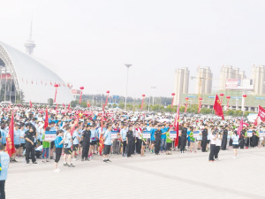 7时许,周口南广场晨队、汉阳路健步走队、大铁牛健步走队、商水快乐健步走队、建业乐邻健步走队、老干部活动中心健步走队等30余支队伍的队员从周口大道、颍河路、庆丰路向周口市体育中心广场汇集,数以千计的市民也不约而同地从四面八方赶往周口市体育中心广场,一时间,该广场全是身穿“行走的力量——‘建业’公益扶贫万人健步走”T恤的人员,大家精神饱满,高兴的神情洋溢在每个人的脸上。这时,建业集团周口区域总公司的上百名员工及周口市义工协会的志愿者来到舞台区、队列区、补水点、折返卡发放点,开始了服务工作。