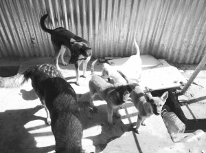 刚接手时,我们专门指定队员王林负责两个爱犬的喂养和训练。刚开始女队员有点害怕,但慢慢地熟悉以后就好了。熊熊和小黑与队员们也逐渐亲热起来:下班时,它们会到驻地门口迎接我们。队员们每天和它们逗乐、嬉戏、玩耍。它们为我们增添了不少乐趣。要知道:在非洲,狗是医疗队的正式编制,并且国家下拨的有喂养资金。因为不安全,特别是我们到埃塞不足两个月时,埃塞政府即宣布国家进入紧急状态。我们驻地围墙又低,安保措施也差,所以熊熊和小黑就是我们的忠诚卫士。我们晚上熟睡时,是熊熊和小黑在为我们站岗放哨,使我们安然地度过了无数个夜晚。