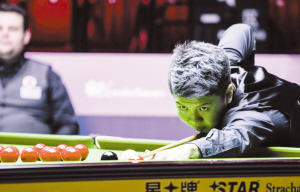 7月5日,中国B队选手周跃龙在比赛中。当日,在江苏省无锡市举行的2017年斯诺克世界杯A组的一场比赛中,以周跃龙/颜丙涛组成的中国B队以4∶1战胜菲格雷多/桑托斯组成的巴西队。