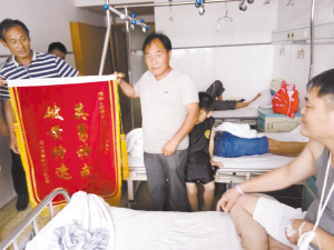 “孙队长,听说你为给俺们破案受了重伤,俺几个村干部代表受害人家属以及村民来看看你。”7月6日上午,受害人所在村的村干部冒雨将一面写着“破案神速、英勇神武”字样的锦旗送到孙艳峰病床前(如图)。孙艳峰刚刚做完手术,目前恢复得很好,他和村干部一一握手,并关切地询问受害人家庭近况。孙艳峰表示:“我这些伤不算啥,当警察抓坏人是我分内的事,犯罪分子被绳之以法才是我最大的心愿。”