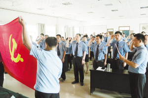 当日,在扶沟县检察院党组书记、检察长苏宏锦的带领下,全体党员干警整齐着装,精神抖擞,面向党旗举起右手,握拳过肩,重温入党誓词,以特殊方式纪念党的生日(如图)。