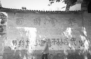 他们在热水塘村一面老旧墙壁上看到抗战时期留下的宣传口号,其中一句是:誓雪国耻(图二)。