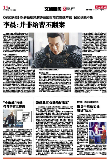 接受采访时,李晨提起“眉毛”哭笑不得,笑言就连邻居小沈阳也发微信调侃他。李晨一本正经地解释眉毛这件事还得从真人秀《奔跑吧兄弟》说起,“那个节目里,网友们总说我的眉毛淡,甚至说我没眉毛,说得我也有点含糊。于是,刚进《军师联盟》剧组时,我看到曹操的头发、胡子都特别浓密,眉毛还特意加了一个尾断,让于和伟老师看起来飞扬跋扈。我就觉得作为他儿子,曹丕是不是也得弄个一样的眉毛,于是让化妆师给我粘了两条一模一样的粗眉。”所以,李晨澄清:“我真的没有得罪化妆师,还是特意要求的,我眉毛的造型其实是有讲究的,比如前期曹丕比较衰的时候,眉尾是向下的,而等他后期登基做了世子以后,眉毛就开始往上刷,眉型的改变会带动整个人的状态变化。”(金力维)