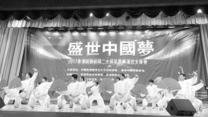 近日,应香港中国民间体育文化交流促进会和《盛世中国梦》组委会的邀请,周口市太极拳协会派代表队参加了香港回归祖国20周年庆典系列活动和《盛世中国梦》演出大奖赛。7月9日,代表队捧回两座奖杯。图为代表队进行表演。晚报记者 王凯 通讯员 黄长明 摄