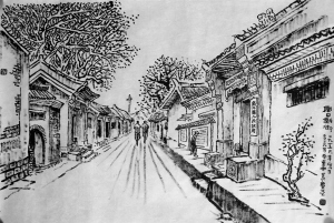 新街位于老街西面,是与老街平行的一条大街。新街原本是一条河,明嘉靖年间,被人填河造屋,成了一道街,被称为新街。画中高大的门楼是富豪李国瑗(李八少)的宅院,新中国成立后成为人民政府的办公地点,像这样的宅院,周口大约有十座,而新街就占4座。