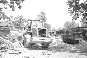 当日9时许,在黄滩行政村沙颍河沿岸,周口晚报记者看到13处“两违”建筑中,已有11处自拆完毕,剩下的两处“两违”建筑拆除现场,城管队员拉起了警戒线,与民警一同维护现场秩序,一台挖掘机正在进行拆除作业(如图),专业拆迁队员则站在违章搭建的彩钢房上,将房顶一一卸除。居委会工作人员现场为围观群众讲解“两违 ”相关法律法规及危害性。