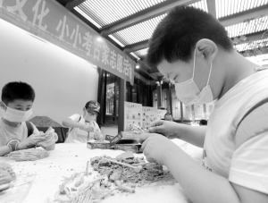 7月17日,孩子们在苏州市泰伯庙参加模拟考古体验活动。