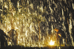 当晚应邀前来表演打铁花的民间艺人来自山西省,领队王全付已年逾六旬。让他开心的是,他的孙子也是表演中的一员。看来,老人还是希望这项民俗绝技后继有人,虽然苦点、累点,但美丽绽放的瞬间,他们与观众一样,收获了快乐!