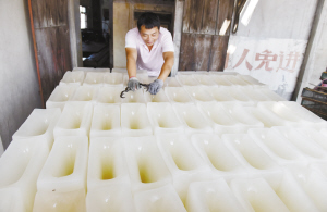 7月23日,安徽巢湖一家制冰厂的工人在搬运制好的冰块。