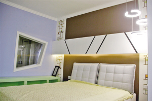 同样,在床背景墙上,运用了巧克力色的不规则线条点缀,可谓“秀色可餐”。而床头灯用的是圆弧灯管,起到点缀的作用。