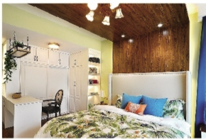 因为主人是周末才来小住,下厨次数不多,因此厨房打通做成了开放式,整体空间视线更开阔;客厅与餐厅之间设置了一个小吧台,依照空间定制的餐柜里设计了红酒格和高脚杯杯架。主卧的定制衣柜,两侧分别做成了开放式的格间,用于收纳和展示女主人心爱的大牌包包,这一贴心的专属设计令女主人备感惊喜,真是“最懂女人的,还是女人”。