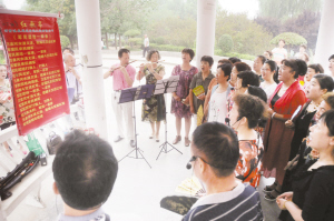 如今,“红歌亭”合唱团已发展成员100多人,其中50多人是铁杆,几乎每天都来唱歌,亭子里站不下,他们就围着亭子唱。亭子里每天都是歌声嘹亮、听者众多,成为沙颍河畔一景。