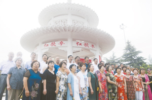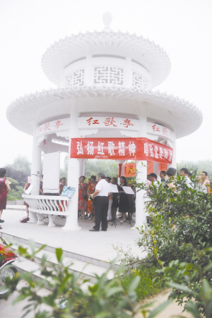 周口中心城区滨河公园里有一个亭子,这个亭子本来没有名字,10年前,在周口四中任化学教师的赵其盈和其他老人每天早晨开始在这里唱红歌,风雨不辍,于是这个亭子就成了“红歌亭”。