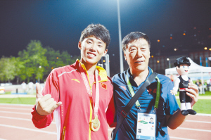 当地时间7月25日,中国选手辛顺(左)赛后与教练员李英彪合影。当日,在土耳其萨姆松举行的第23届夏季听障奥运会男子标枪决赛中,中国选手辛顺以66米63的成绩获得冠军。
