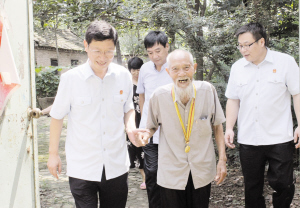 王金刚老人现年91岁,14岁参军,是郸城县目前为数不多的参加过抗日战争的老兵之一,获得了由中共中央、国务院、中央军委颁发的“中国人民抗日战争胜利70周年纪念章”。农家小院里,王洪彬院长与王金刚老人亲切交谈,详细了解老人的身体情况和生活情况。王金刚老人讲述了自己参军的经历,还拿出纪念抗战胜利奖章,和王洪彬一起回顾革命历史,感慨革命胜利来之不易。临走时,王金刚老人一直握着王洪彬的手,欣喜和不舍之情溢于言表(详细报道见今日10版)。