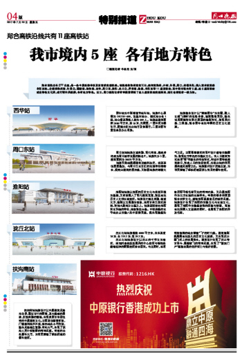 郑合高铁全长277公里,是一条中原连接华东及东南的高速铁路。该线路自郑州南站引出,经河南郑州、开封、许昌、周口,安徽阜阳,接入商合杭铁路阜阳西站。全线设郑州南、许昌北、鄢陵南、扶沟南、西华、周口东、淮阳、沈丘北、界首南、临泉、阜阳西等11座高铁站,其中我市境内有5座,这5座高铁站或走特色文化风,或打精神风貌牌,各有地方特色。近日,周口晚报记者有幸提前看到了这几座高铁站的效果图,现在也请读者一睹为快。