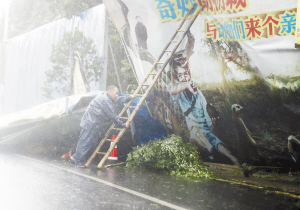 7月30日,福建省福清市海口镇的一名工作人员在支撑即将被大风吹倒的路边广告牌。