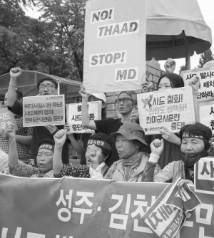“‘萨德’无法保护韩国,立即停止部署,立即撤除‘萨德’!”在位于首尔的韩国国防部门前,百余名韩国民众振臂呐喊。来自“萨德”系统在韩部署地星州郡的居民以及各地和平人士举行集会,反对继续部署“萨德”剩余装备。
