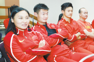 当地时间7月31日,中国田径队短跑运动员张培萌(左二)、谢震业(右二)参加动员会。当日,中国田径队2017伦敦世锦赛动员会在英国伦敦举行。伦敦田径世锦赛将于8月4日至13日举行。