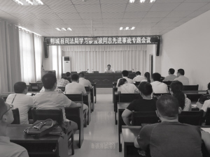 本报讯 7月26日上午,郸城县司法局在六楼会议室召开“学习廖俊波同志先进事迹”专题会(如图),会议由郸城县司法局党组书记、局长段居华主持,局机关全体人员,各司法所所长参加会议。