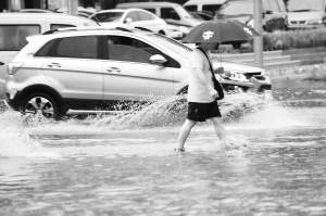 8月3日,行人和车辆经过长春市东盛大街的积水路面。
